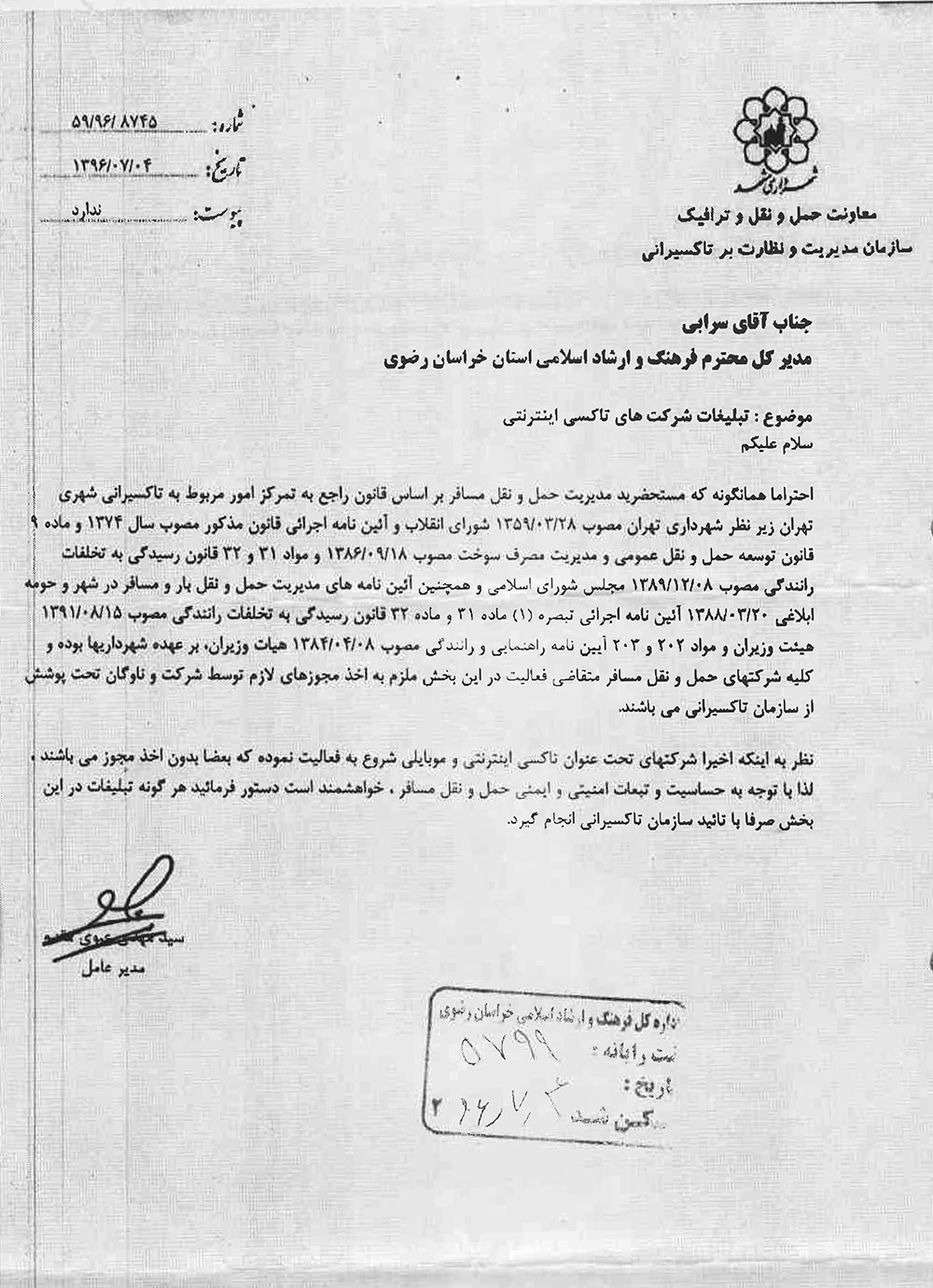 نظر به این که اخیرا شرکت های تحت عنوان تاکسی اینترنتی و موبایلی شروع به فعالیت نموده که بعضا بدون اخذ مجوز می باشند، لذا با توجه به حساسیت و تبعات امنیتی و ایمنی حمل و نقل مسافر، باید هرگونه تبلیغات در این بخش صرفا با تایید سازمان تاکسیرانی انجام گیرد.