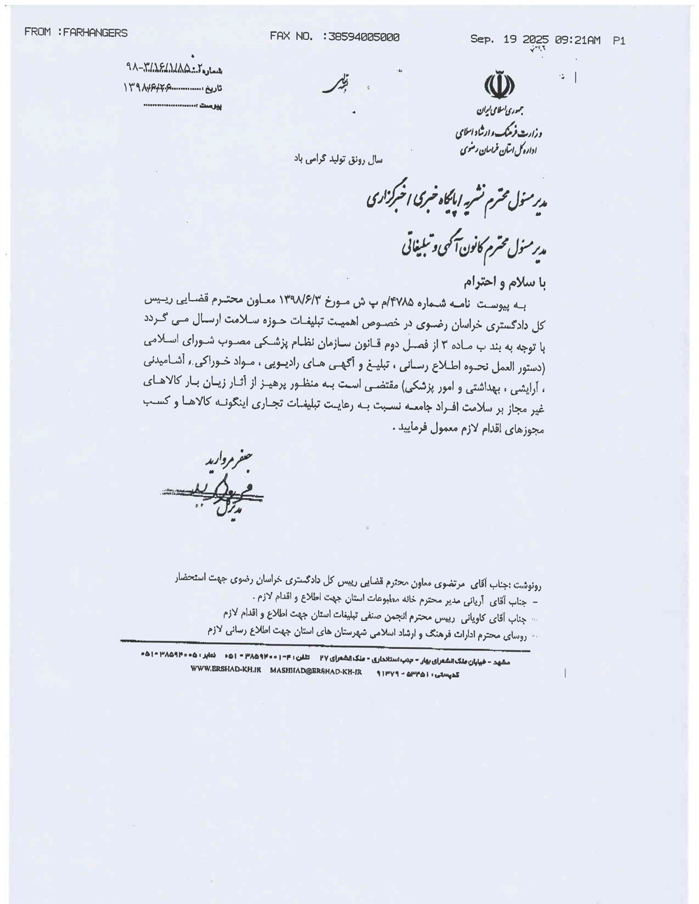 نامه جناب آقای دکتر مروارید در خصوص اهمیت تبلیغات در حوزه سلامت