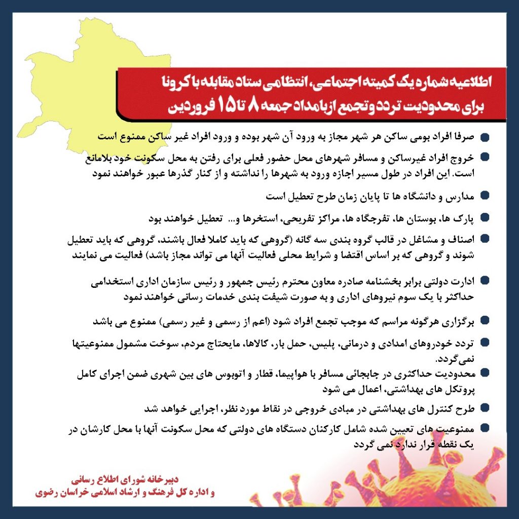اطلاعیه شماره یک کمیته اجتماعی، انتظامی ستاد مقابله با کرونا