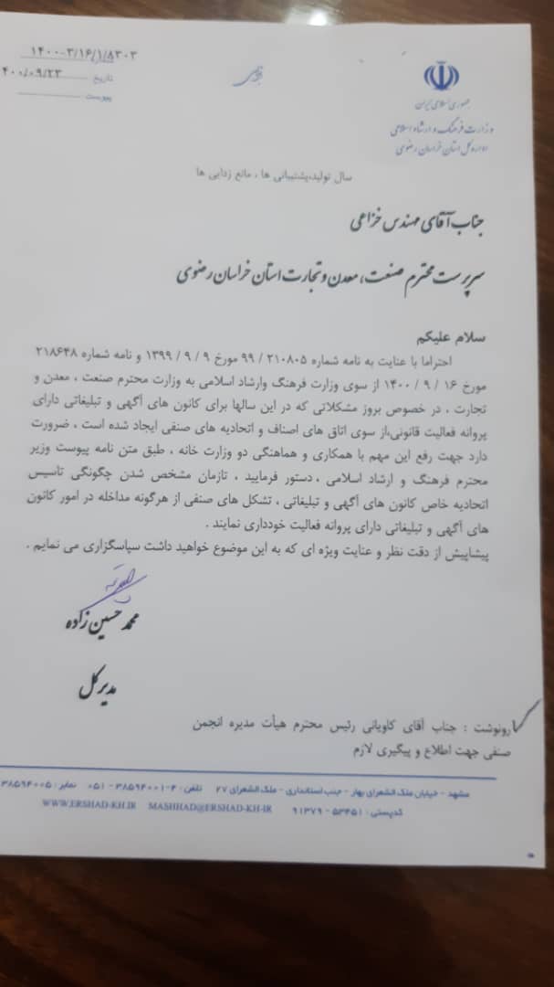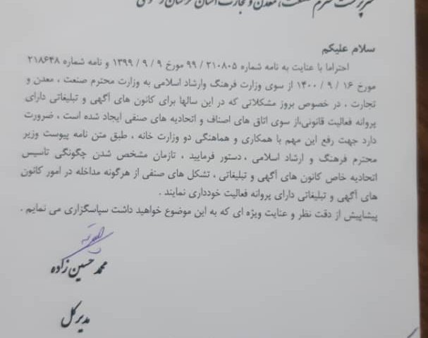 احتراما با عنایت به نامه شماره 99/210805 مورخ 1399/09/09 و نامه شماره ۲۱۸۶۴۸ مورخ ۱۴۰۰/۰۹/۱۶ از سوی وزارت فرهنگ و ارشاد اسلامی به وزارت محترم صنعت ، معدن و تجارت ، در خصوص بروز مشکلاتی که در این سالها برای کانون آگهی و تبلیغاتی دارای پروانه فعالیت قانونی ، از سوی اتاق های اصناف و اتحادیه های صنفی ایجاد شده است ، ضرورت دارد جهت رفع این مهم با همکاری و هماهنگی دو وزارت خانه ، طبق متن نامه پیوست وزیر محترم فرهنگ و ارشاد اسلامی ، دستور فرمایید ، تا زمان مشخص شدن چگونگی تاسیس اتحادیه خاص کانون های آگهی و تبلیغاتی ، تشکل های صنفی از هرگونه مداخله در امور کانون های آگهی و تبلیغاتی دارای پروانه فعالیت خود داری نمایند .